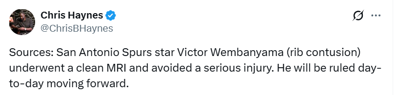 幸无大碍!文班X光+核磁检查都没问题 名记相信他肯定获评奖资格